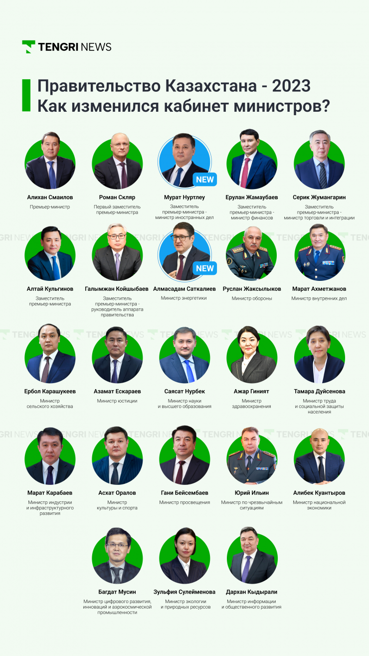 Президент Касым-Жомарт Токаев сменил двух членов кабмина. Новым лицом в правительстве стал заместителем премьер-министра и министр иностранных дел 47-летний Мурат Нуртлеу. Ранее он занимал должность руководителя Администрации Президента. Министром энергетики был назначен Алмасадам Саткалиев (53 года). Ранее эту должность занимал Болат Акчулаков - он стал советником Президента.