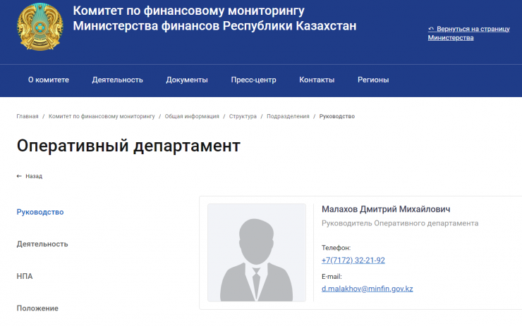По данным сайта Комитета по финансовому мониторингу Министерства финансов, до сегодняшнего дня Малахов Дмитрий Михайлович занимал должность руководителя Оперативного департамента КФМ.