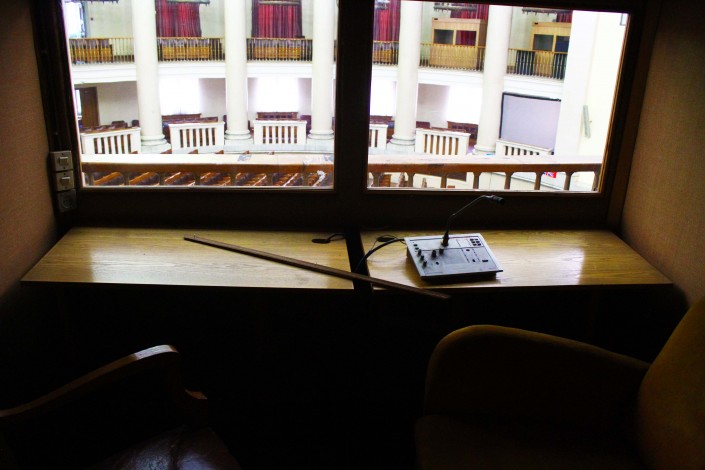 Кабинки переводов, по словам Ирины Михайловны, появились, когда в Казахстане создали двухпалатный Парламент. В самой кабинке сейчас сохранился один микрофон.