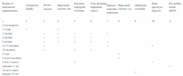 Ранее сообщалось, что в перечень заболеваний, против которых проводятся обязательные профилактические прививки, вошли: вирусный гепатит А (В15), вирусный гепатит В (В16), гемофильная инфекция типа b (В96.3), дифтерия (А36), злокачественные новообразования шейки матки (С53), коклюш (А37), корь (В05), краснуха (В06), пневмококковая инфекция (В95.3), полиомиелит (А80), столбняк (А33-А35), туберкулез (А15-А19) и эпидемический паротит (В26).