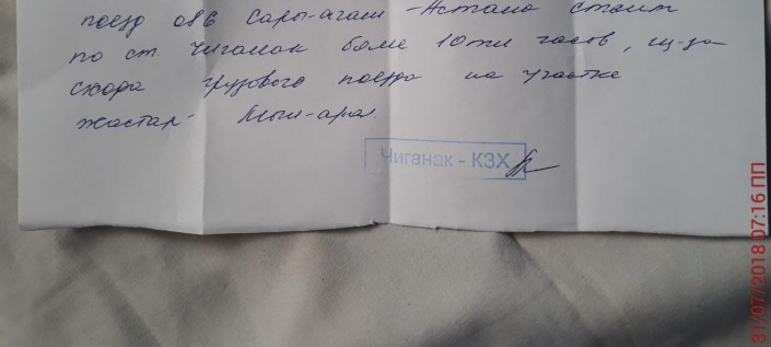 По словам пассажиров поезда №86 Сарыагаш - Астана, тем, кто из-за задержки поезда опаздывает на работу, раздают такие справки.