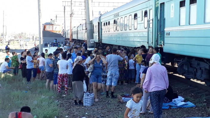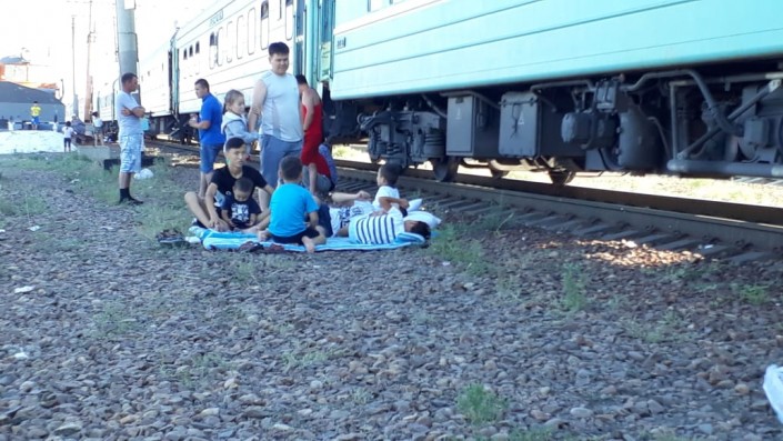 По словам очевидца, среди пассажиров много детей и женщин. Люди прячутся от сильной жары в тени поезда. Ближе к вечеру к вагонам подвезли еду. Детям раздали бутерброды с колбасой. На видео, присланном в редакцию, люди продают еду пассажирам по цене от 500 тенге за порцию.