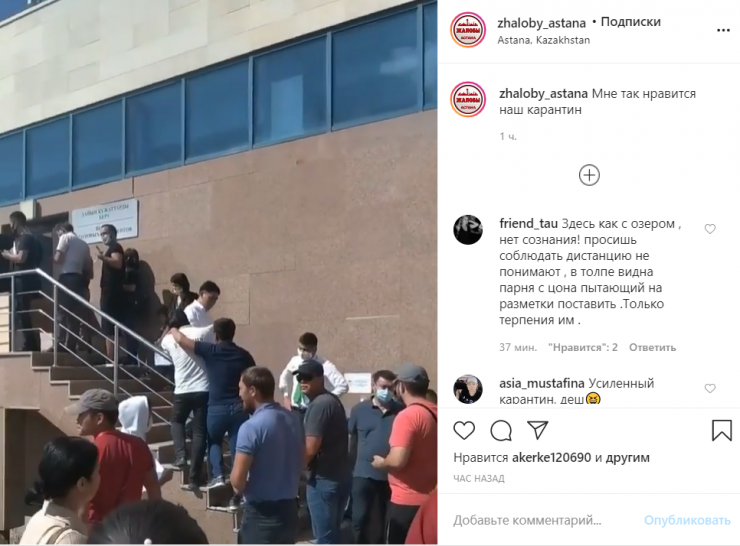 В Сети распространилось видео, снятое около спецЦОНа в Нур-Султане, на котором видно, что люди стоят в очереди близко друг к другу, игнорируя дистанцию и масочный режим, передает корреспондент Tengrinews.kz.