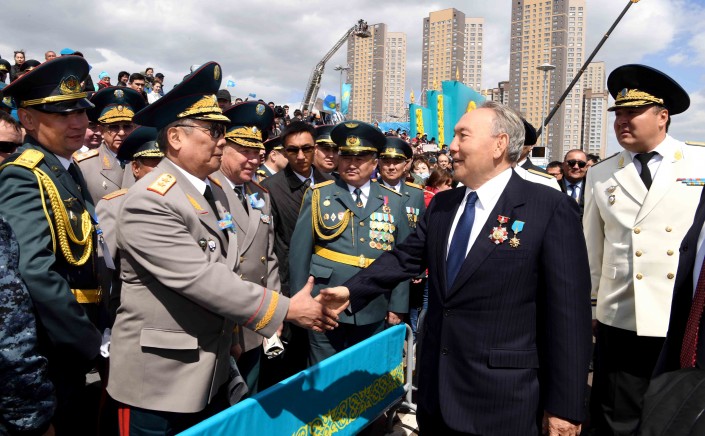 "Уважаемые участники парада, поздравляю всех, кто служит в правоохранительных органах с 25-летием Вооруженных Сил нашей страны (...). У нас нет врагов ни в одной точке земного шара. Мы строим отношения дружбы и доверия по всему периметру с нашими соседями, мы дружны с ними. Мы помним мудрый завет, что единственное мирное соглашение дороже ста побед", - сказал Нурсултан Назарбаев на церемонии открытия военного парада, посвященного 25-летию образования Вооруженных Сил Республики Казахстан и Дню Победы.