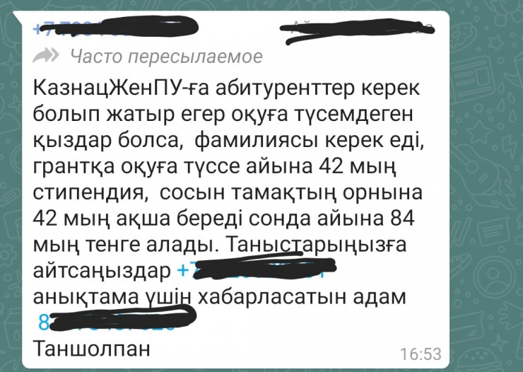 Оның айтуынша, хабарламадағы "абитуриенттер керек" және "фамилиясы керек" деген сөздерге қатысты бірқатар адам күмәнмен хабарласқан.