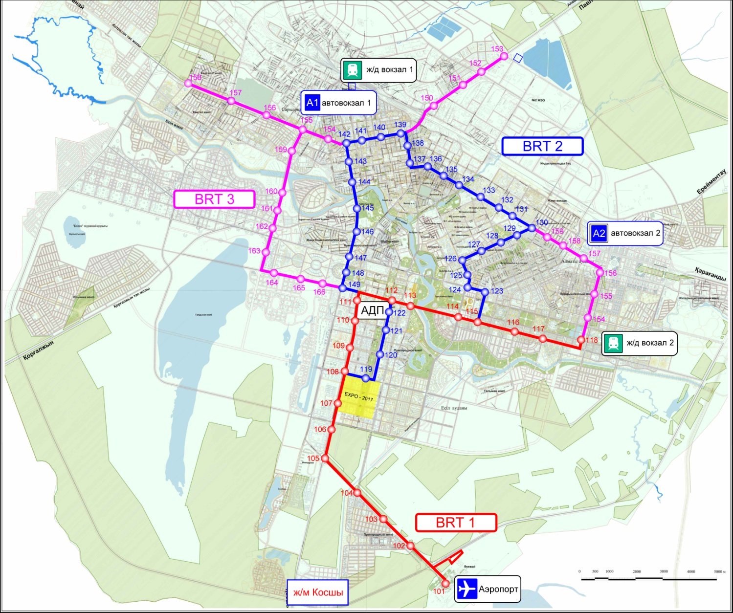 Опубликована схема будущих линий BRT (Bus rapid transit, BRT - система скоростного автобусного транспорта) в Астане, передает корреспондент Tengrinews.kz со ссылкой на пресс-службу столичного акимата.