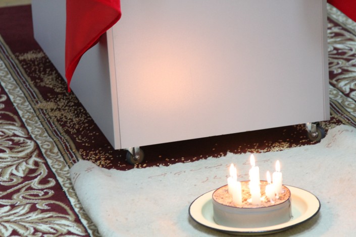 Как стало известно, для останков в Музее выделили специальную комнату. Контейнер на колесиках установили по центру комнаты, застелили его красным полотном и рядом зажгли свечи.