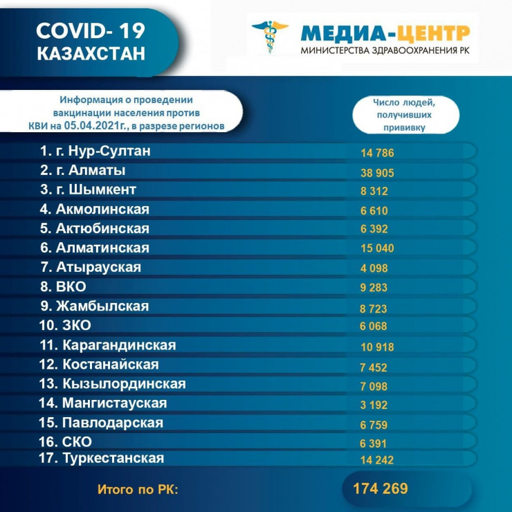 Всего в Казахстане, по данным на 5 апреля, вакцинацию прошли 174 269 человек