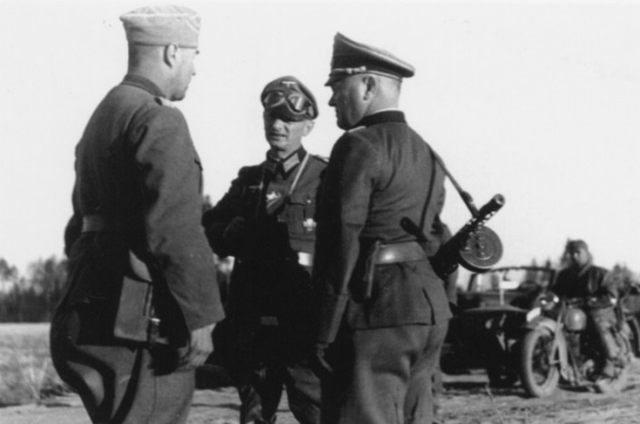 Совещающиеся на дороге немецкие офицеры с трофейным ППШ