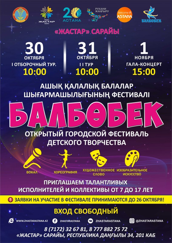 С 30 октября по 1 ноября во дворце "Жастар" также запланирован открытый городской фестиваль детского творчества "Балбобек". Кроме того, 1 ноября в рамках этого фестиваля пройдет мастер-класс по изобразительному искусству.