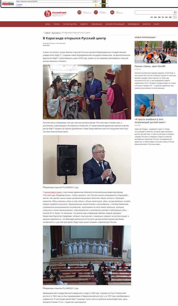 Центр русского языка был открыт в Карагандинском университете имени Букетова  4 июня. Карагандинские общественники заподозрили его связь с "Русским миром", после того как на официальном сайте фонда появилась информация об этом. Однако вскоре она была удалена. Но в Сети остались скриншоты, которые опубликовал ряд СМИ, а по запросу Google выдает ссылку на эту новость, размещенную ранее на сайте фонда, и надпись - "элемент не найден".