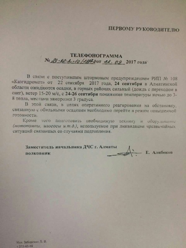 На основании штормового предупреждения ДЧС Алматы разослал телефонограмму руководителям служб гражданской защиты. "В целях оперативного реагирования на обстановку, связанную с обильными осадками, необходимо перейти в режим повышенной готовности. Кроме того, подготовить необходимую технику и оборудование, используемое при ликвидации чрезвычайных ситуаций, связанных со случаями подтопления", - говорится в телефонограмме.