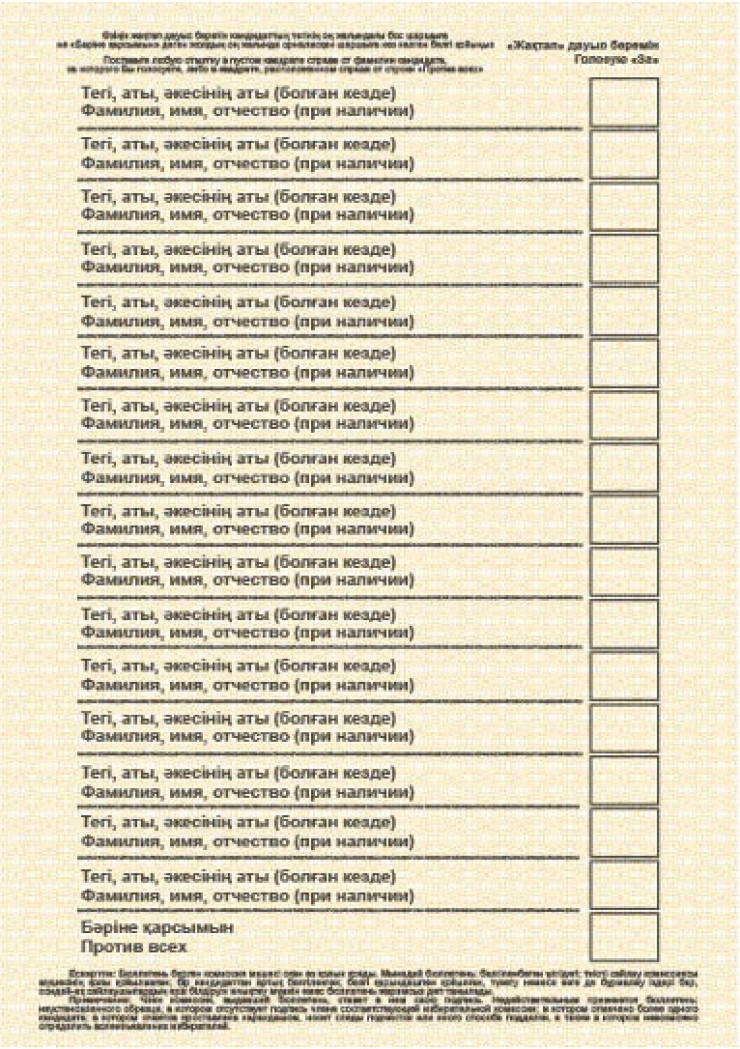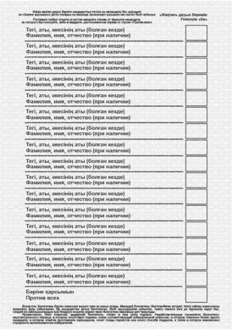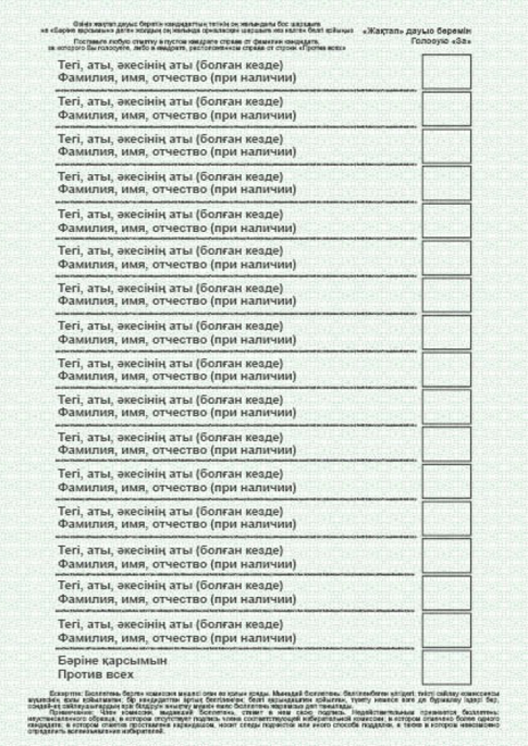 Бланк бюллетеня аналогичный бланку по кандидатам в депутаты маслихата. Вариативный формат бюллетеня, то есть до 16 кандидатов. Формат А5, размер - 148 на 210 миллиметров, больше 16 кандидатов - выкраиваемый формат 148 на 500 миллиметров.