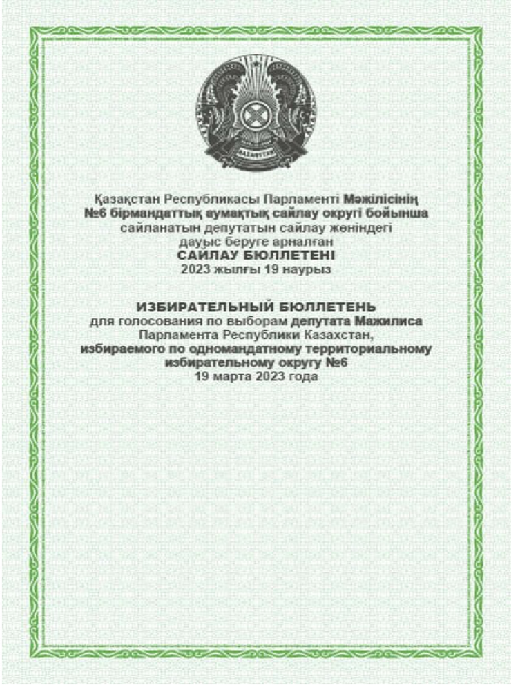 Избирательный бюллетень для голосования по выборам депутатов Мажилиса Парламента, избираемых по одномандатным территориальным избирательным округам, будет представлен в зеленом цвете.