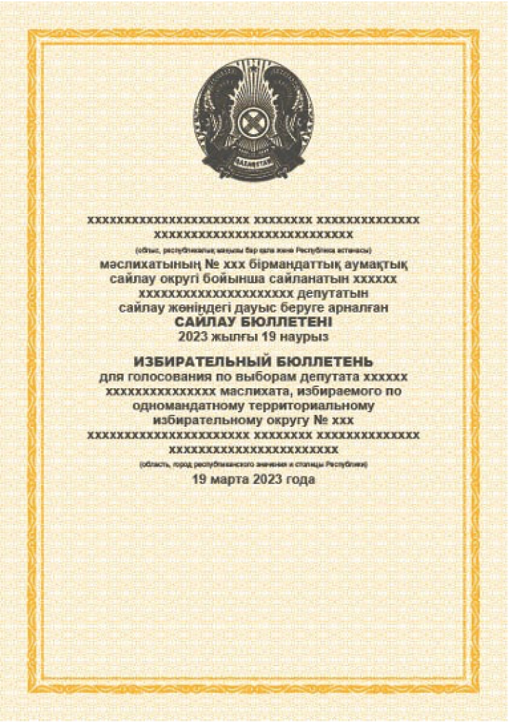 Избирательный бюллетень для голосования по выборам депутатов маслихатов областей, городов республиканского значения и столицы, избираемых по одномандатным территориальным избирательным округам, будет представлен в оранжевом цвете.