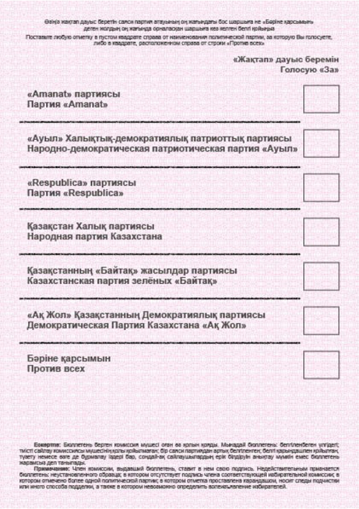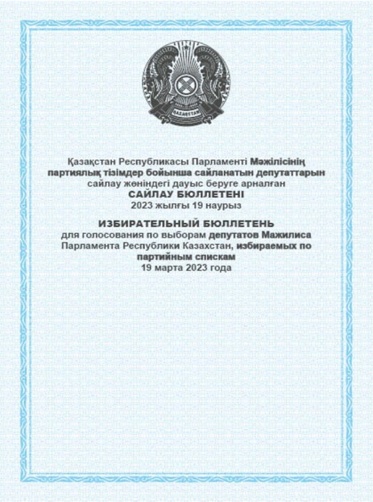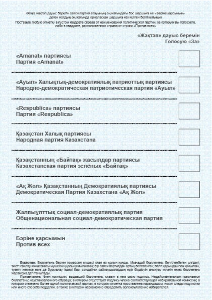 Бланк бюллетеня двусторонний, первая сторона - герб Казахстана, наименование бюллетеня. Вторая сторона - наименование политических партий в порядке, определенном жеребьевкой.