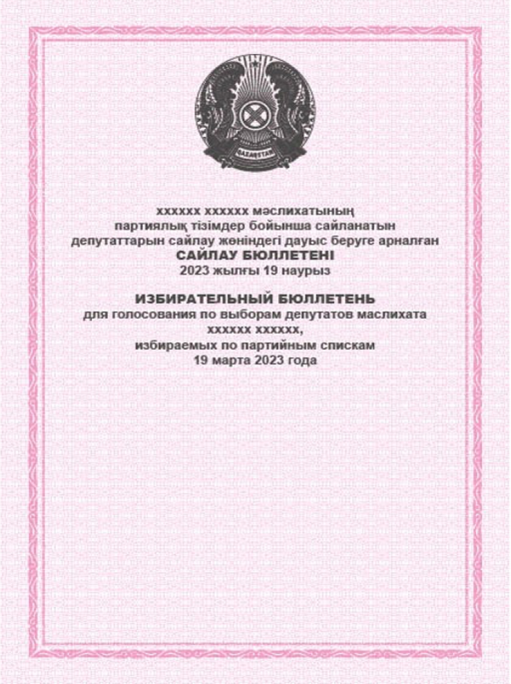 Избирательный бюллетень для голосования по выборам депутатов маслихатов областей, городов республиканского значения и столицы, избираемых по партийным спискам, будет в пурпурном цвете.