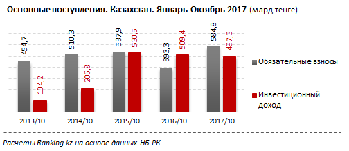 Объем обязательных взносов за январь-октябрь 2017 года составил 584,8 миллиарда тенге, рост за год на 48,7 процента (191,5 миллиарда тенге).