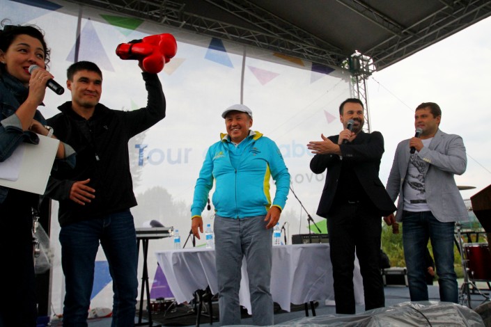 Помимо этого, была разыграна футболка с автографом олимпийского чемпиона Дмитрия Баландина, ушедшая в итоге за 1,45 миллиона тенге. На продажу также выставили автограф Серика Сапиева на собственных перчатках. Боксер лично вручил его победителю аукциона -предпринимателю Нурлану Смагулову.