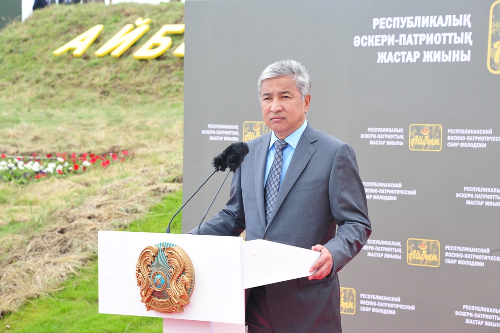 "Сердечно приветствую лучших представителей военно-патриотических клубов, курсантов военных школ и студентов военных кафедр высших учебных заведений со всего Казахстана. В нашей стране действует около двух тысяч военно-патриотических организаций, которые готовят к ратному делу будущее молодое поколение Вооруженных Сил Республики Казахстан. Защита Родины - Мәңгілік Ел и служба в армии - самая почетная обязанность каждого казахстанца. Быть профессиональным защитником Отечества - проявление высшего патриотизма. Уверен, что все вы будете достойными наследниками славного исторического прошлого нашего народа, что навсегда останетесь верны памяти героев, 70 лет назад одержавших победу в Великой Отечественной войне. Забота об армии, ее современном вооружении и боевой готовности - это важная часть Плана Нации - 100 конкретных шагов по модернизации Казахстана, выполнение которого уже началось. Желаю всем участникам республиканского военно-патриотического сбора "Айбын" выдержки, стойкости, боевой выучки, командного духа и товарищеской взаимопомощи", - процитировал глава Минобороны слова Главы государства.