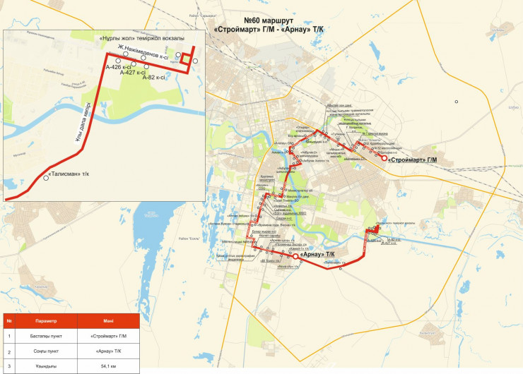 Схема маршрута следующая: до конечного пункта "ЖК "Талисман" без изменений, прямо по проспекту Улы дала, далее по мосту через реку Есиль, направо на улицу Нажимеденова, далее до железнодорожного вокзала Нурлы жол.