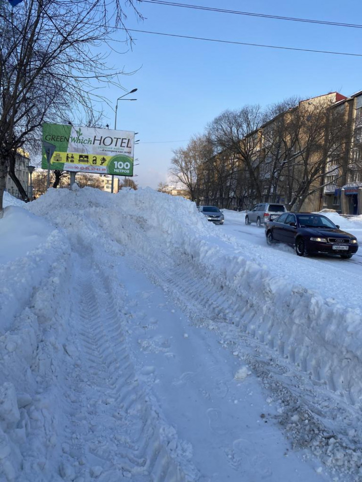 Пешеходам приходится обходить огромные сугробы по автомобильной дороге. В некоторых местах они достигают и трехметровой высоты, за которой не видно ни людей, ни выезжающих машин.