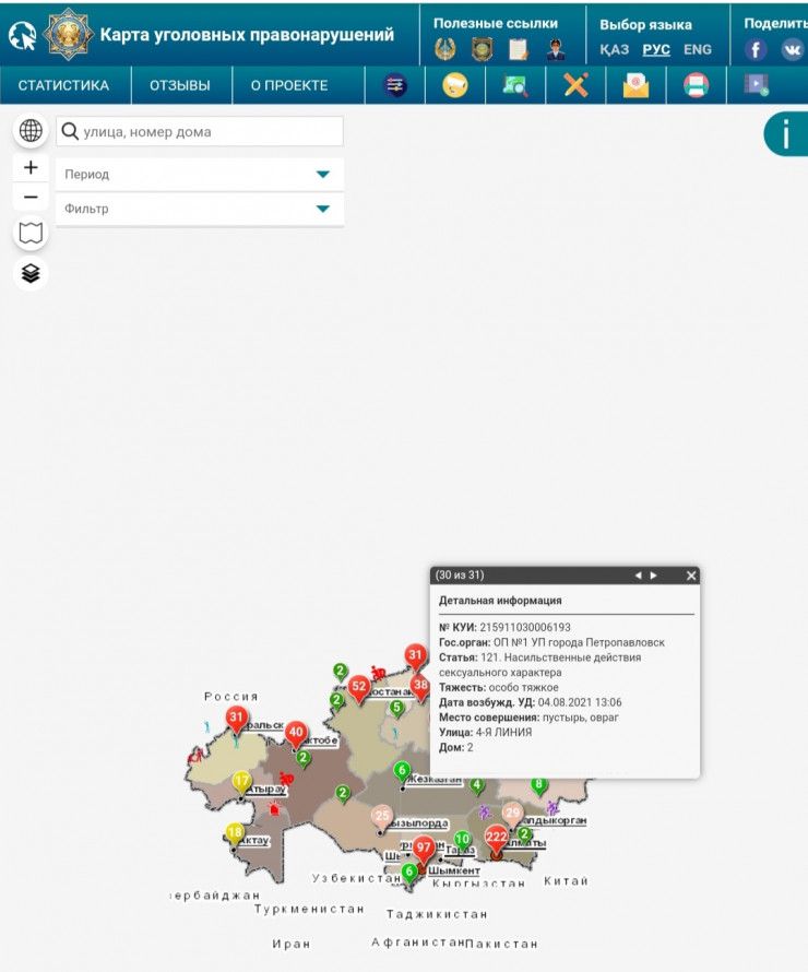 Оба преступления внесены в Карту уголовных правонарушений. Там отмечено, что одно из нападений произошло на пустыре близ тубдиспансера, второе - на улице имени Тауфика Мухамед-Рахимова.