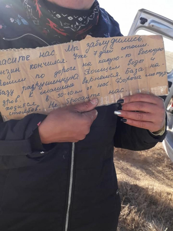 "Спасите нас. Мы заблудились. Бензин закончился. Уже семь дней стоим. Пошли по дороге на какую-то военную базу разрушенную. Поищем воды и дров. К машине вернемся. База находится в 30-40 километрах от нас. Дорога между столбов. Не бросайте нас", - говорилось в записке.