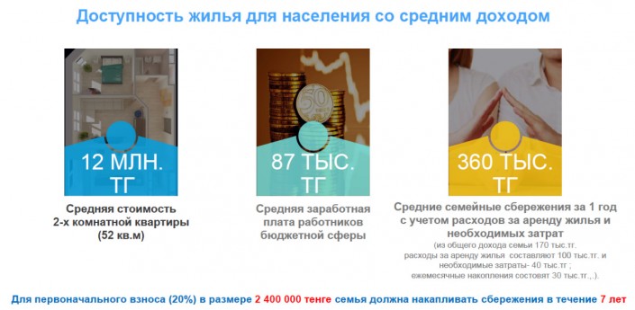 "Он ("Жилстройсбербанк" - прим.) выделяет кредитные ресурсы на 15 лет под небольшой процент, на первом этапе хотим выдать 10 тысяч квартир. С перспективой роста до 20 тысяч. Но при условии: 5-7 лет отработать в городских структурах. У нас есть 9 тысяч учителей, из них 5 тысяч без жилья. Мы строим школы, и в ближайшие пять лет потребуется 5 тысяч квалифицированных педагогов. Такая же ситуация по полицейским, врачам. Мы должны укрепить городские службы качественными специалистами. От этого зависит комфорт жителей", - сказал Исекешев.