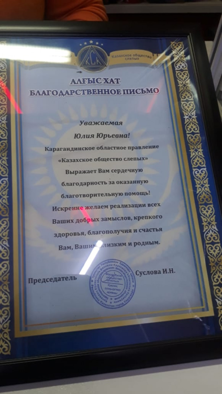 "В ответ на такую спонсорскую помощь председатель наградила секс-шоп благодарственным письмом, которое сейчас украшает магазин. Я лично видел его на витрине секс-шопа, и меня это возмутило. Магазин опубликовал фото благодарственного письма в соцсетях и делает себе рекламу, что якобы их товары пользуются спросом даже у Казахского общества инвалидов. Это возмутительно. Наше общество является общественной организацией, у которой имеются морально-нравственные устои. Устав Казахского общества слепых основывается на Конституции страны и нетерпимости к аморальному поведению. А поступок председателя дискредитирует наше общество, в котором состоят пожилые люди, инвалиды детства, у которых и без того немало забот, которые борются за жизнь. Он принижает авторитет нашего общественного объединения, которому уже больше 85 лет", - возмущается Баксултан Бейсенов.