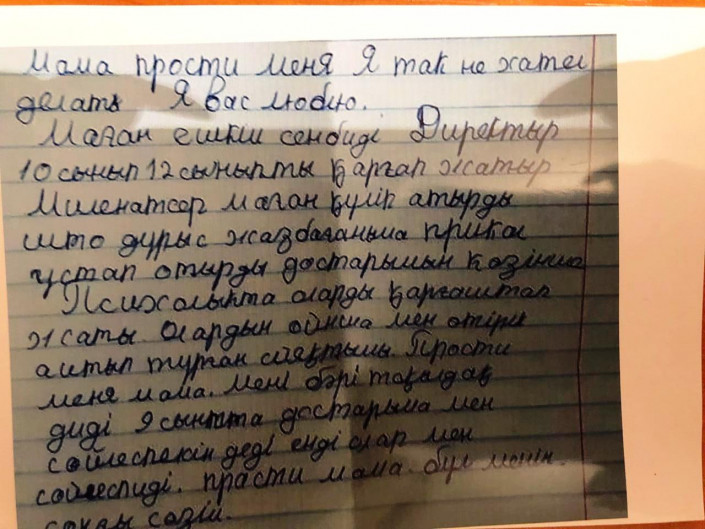 "Прости, мама. Это мое последнее слово", - написал мальчик. В конце он указывает список вещей, оставшихся в школе: куртка, телефон и сумка.