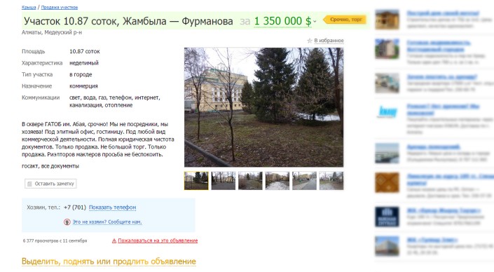 "В сквере ГАТОБ им. Абая, срочно! Мы не посредники, мы хозяева! Под элитный офис, гостиницу. Под любой вид коммерческой деятельности. Полная юридическая чистота документов. Только продажа. Небольшой торг. Только продажа. Риелторов, маклеров просьба не беспокоить. Госакт, все документы".