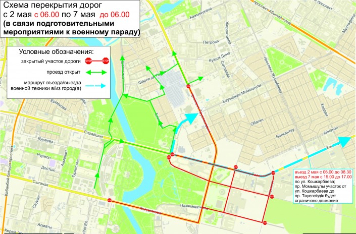 "Вниманию водителей! 3 и 4 мая с 10.00 до 12.00 часов в период проведения Министерством обороны РК тренировок и репетиций на площади "Қазақ Елі" военного парада, посвященного 25-летию образования Вооруженных Сил, в целях обеспечения безопасности дорожного движения будет ограничено движение на следующих улицах города:
