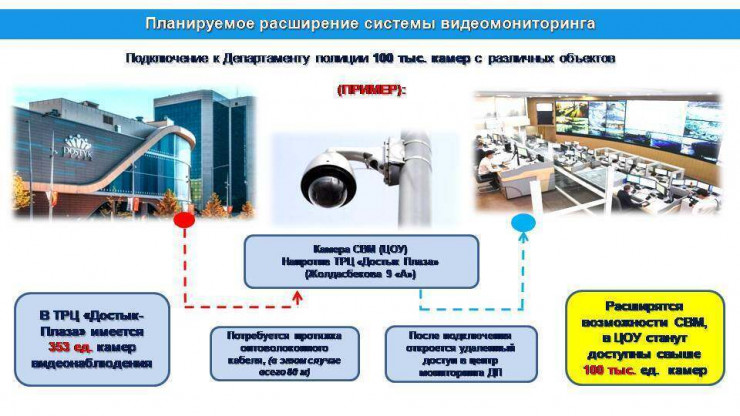 Отмечается, что в городе разрабатывается проект, согласно которому стражи порядка получат доступ ко всем видеокамерам на различных объектах Алматы. Департамент полиции получит доступ к 100 тысячам камер.