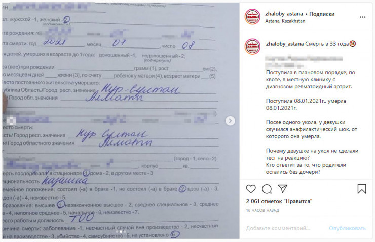 "Ей сделали укол и у нее развился анафилактический шок. Они сначала должны были тест на аллергическую реакцию сделать, а только потом делать укол", - рассказал брат погибшей.