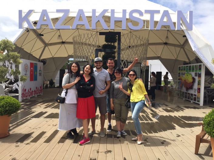 Группа казахстанских журналистов и блогеров во время посещения казахстанского павильона на EXPO-2016.