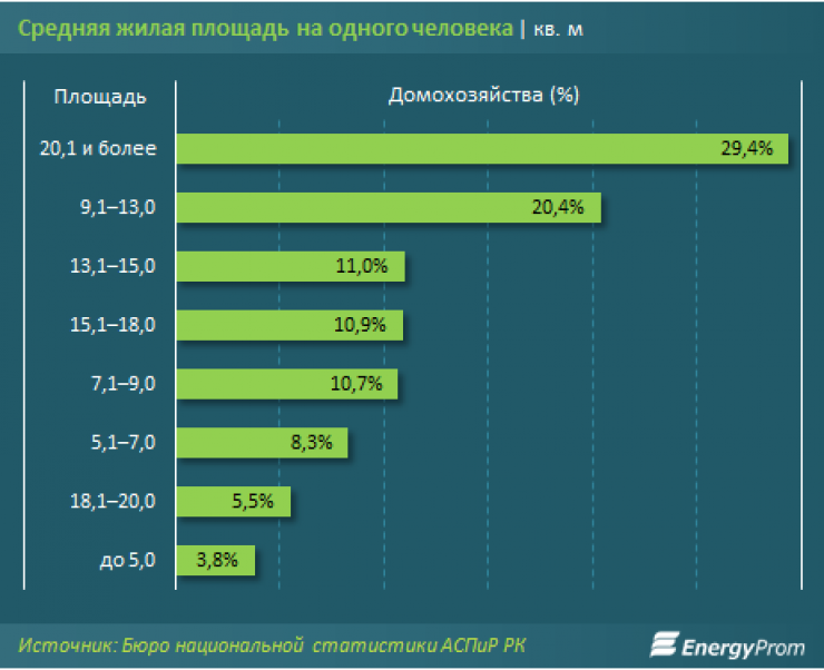 В 29,4 процента домашних хозяйств страны жилая площадь на одного человека составляет 20,1 и более квадратных метров. При этом в 3,8 процента домохозяйств показатель составил менее пяти квадратных метров.