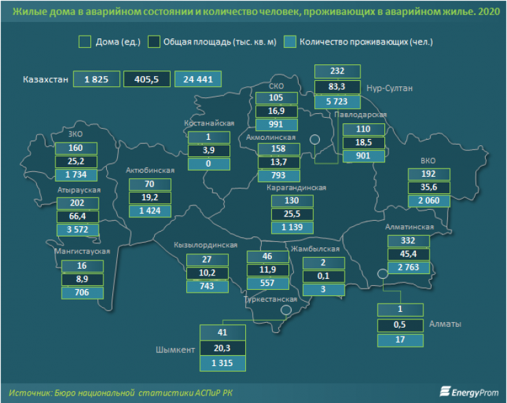 В аварийном состоянии находятся 1,8 тысячи домов общей площадью 405,5 тысячи квадратных метров. В них проживают 24,4 тысячи человек. Больше всего аварийных домов в Алматинской области: 332 строения. В тройку проблемных регионов с наибольшим количеством подобных неблагополучных домов также вошли столица и Атырауская область.