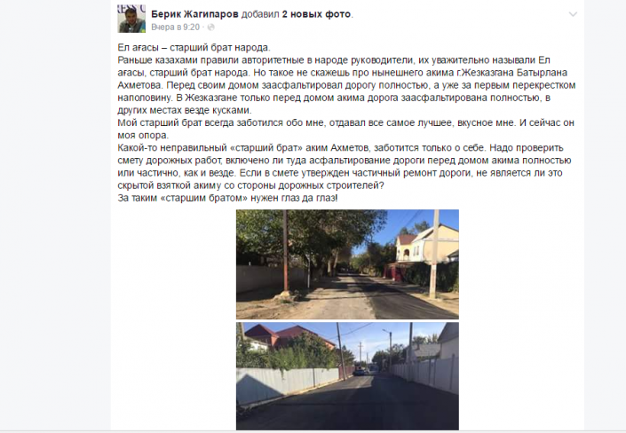 Пользователь соцсети Facebook Берик Жагипаров разместил на своей странице фотографию, на которой изображена заасфальтированная дорога. Автор публикации с сожалением отмечает, что хорошее качество дороги можно наблюдать лишь по улице, где живет аким города Батырлан Ахметов.