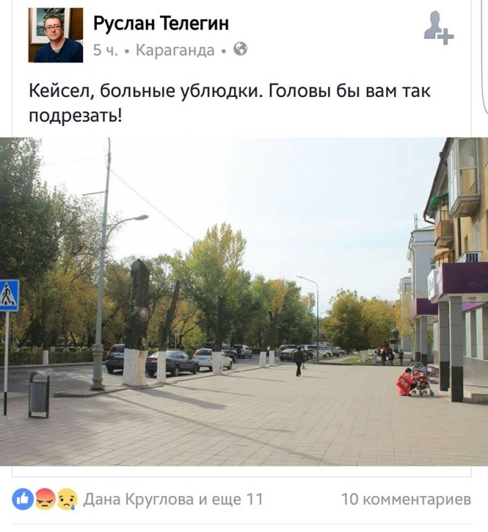 Поводом для обсуждения стал его пост на своей личной странице Facebook с нелестными выражениями в адрес сотового оператора. "Кейсел, больные ублюдки", - написал он к фотографии, где срублены деревья возле офиса компании Kcell. Чиновника сразу обсмеяли, отметив, что разрешение на вырубку деревьев дает акимат, и советник акима должен был этот момент уточнить. Пользователи пожаловались Департаменту по делам государственной службы на поведение госслужащего, посчитав его пост хамским. В Kcell подтвердили, что вырубку деревьев производила администрация города.