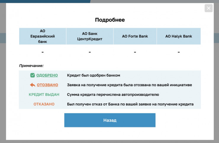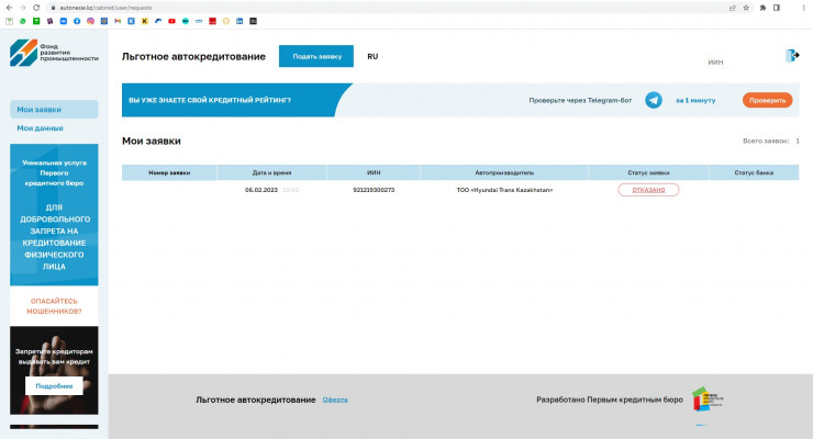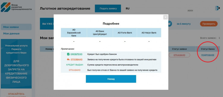 По словам казахстанцев, в личном кабинет у них в разделе "статус заявки" высвечивается результат "отказано". А в разделе "статус банка" написано "подробнее" с активной ссылкой на дополнительную вкладку.