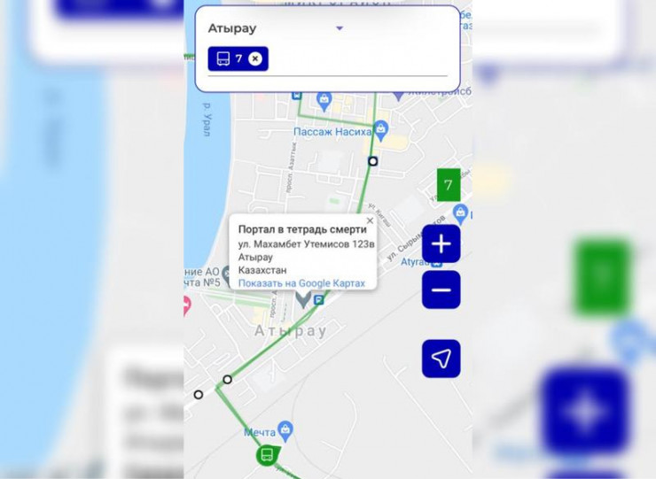 "Когда открываешь в сотовом телефоне приложение Avtobys, там выбираешь маршрут, нажимаешь функцию "Поехали!" и далее видишь движение автобуса по карте, все отслеживает GPS. Так вот здание по Махамбета, 123В было обозначено как "Портал в тетрадь смерти". Что это такое? Как и кто это так назвал?" - спрашивает девушка, подкрепляя свое сообщение скриншотами.