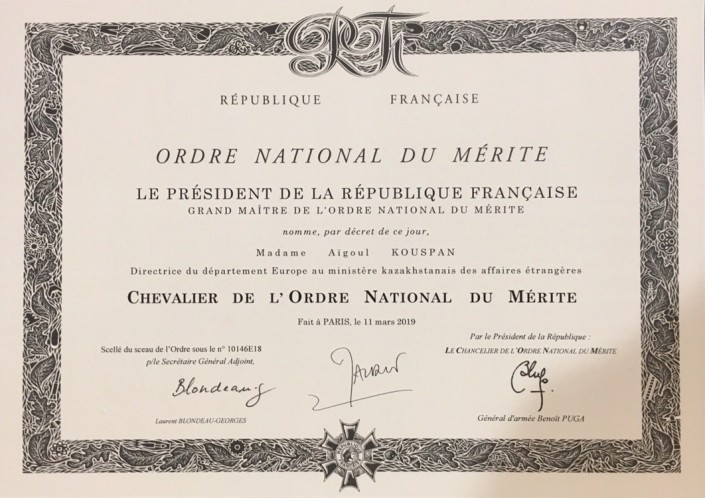 Посол Казахстана награждена национальным орденом Франции