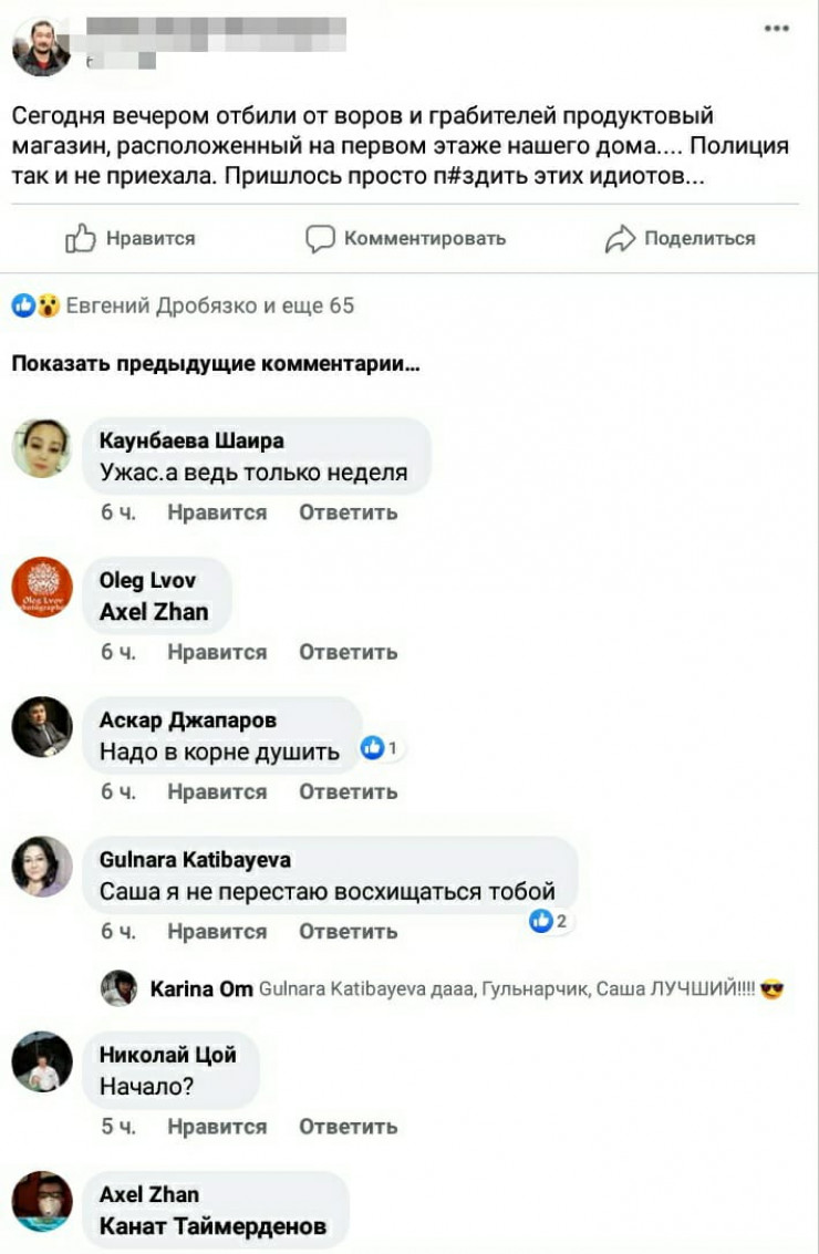 Житель Алматы написал пост, в котором рассказал, что жители одного из домов в одиночку отбили от грабителей продуктовый магазин, а полиция так и не приехала. Однако в городском ДП опровергли правдивость изложенного, передает Tengrinews.kz со ссылкой на пресс-службу ведомства.