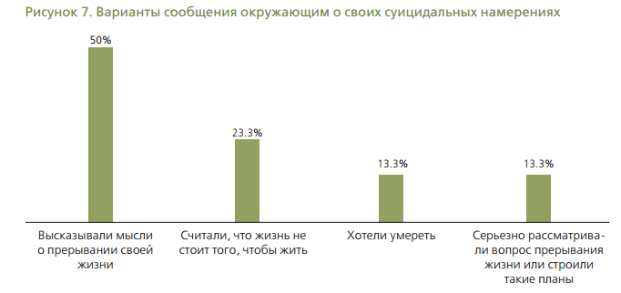 25 процентов из тех, кто совершал попытку самоубийства, но остался в живых, указали, что сообщали члену семьи или другу в той или иной форме о своих суицидальных намерениях.