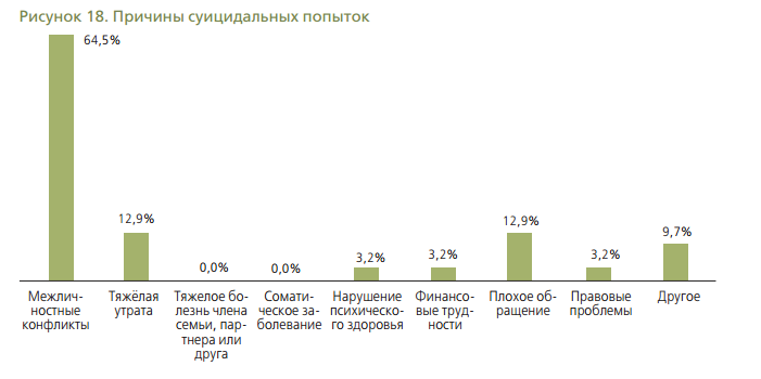 "Полученные данные подтвердили, что наличие психических расстройств и нарушений, особенно симптомов депрессии, является одним из самых важных факторов риска, предрасполагающих к суициду. При этом анализ лечения, оказанного после суицидальных попыток, показал, что только небольшой процент лиц, совершавших попытку самоубийства, был направлен в психиатрическую или психологическую службу", - говорится в тексте исследования.