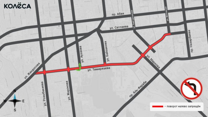 По Тимирязева автобусы и троллейбусы будут курсировать по левому ряду, а автомобилям оставят правый. Все левые повороты с улицы Тимирязева при этом уберут от Жандосова до Желтоксан. Уйти налево водители смогут только на пересечении с улицей Ауэзова, если воспользоваться поворотной площадкой перед "Атакентом".