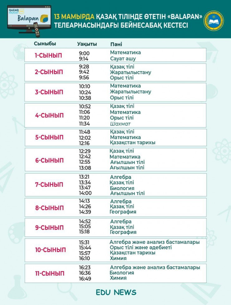 Расписание телеуроков для 1-11-х классов с казахским языком обучения на телеканале "Балапан".