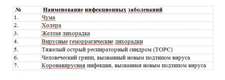 В перечень инфекционных заболеваний, при угрозе возникновения и распространения которых вводятся ограничительные мероприятия и карантин, вошли: