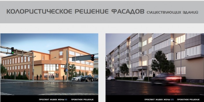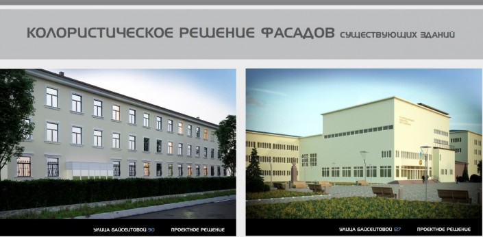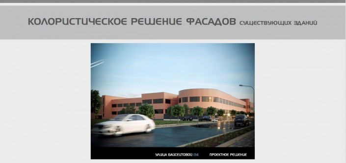 По данным экспертной группы, колористическое решение фасада здания по адресу: улица Кунаева, 51, неприемлемо, так как предлагает закраску естественного камня, которым отделано здание. В связи с этим рекомендовано сохранить существующую облицовку с восстановлением ее свойств.